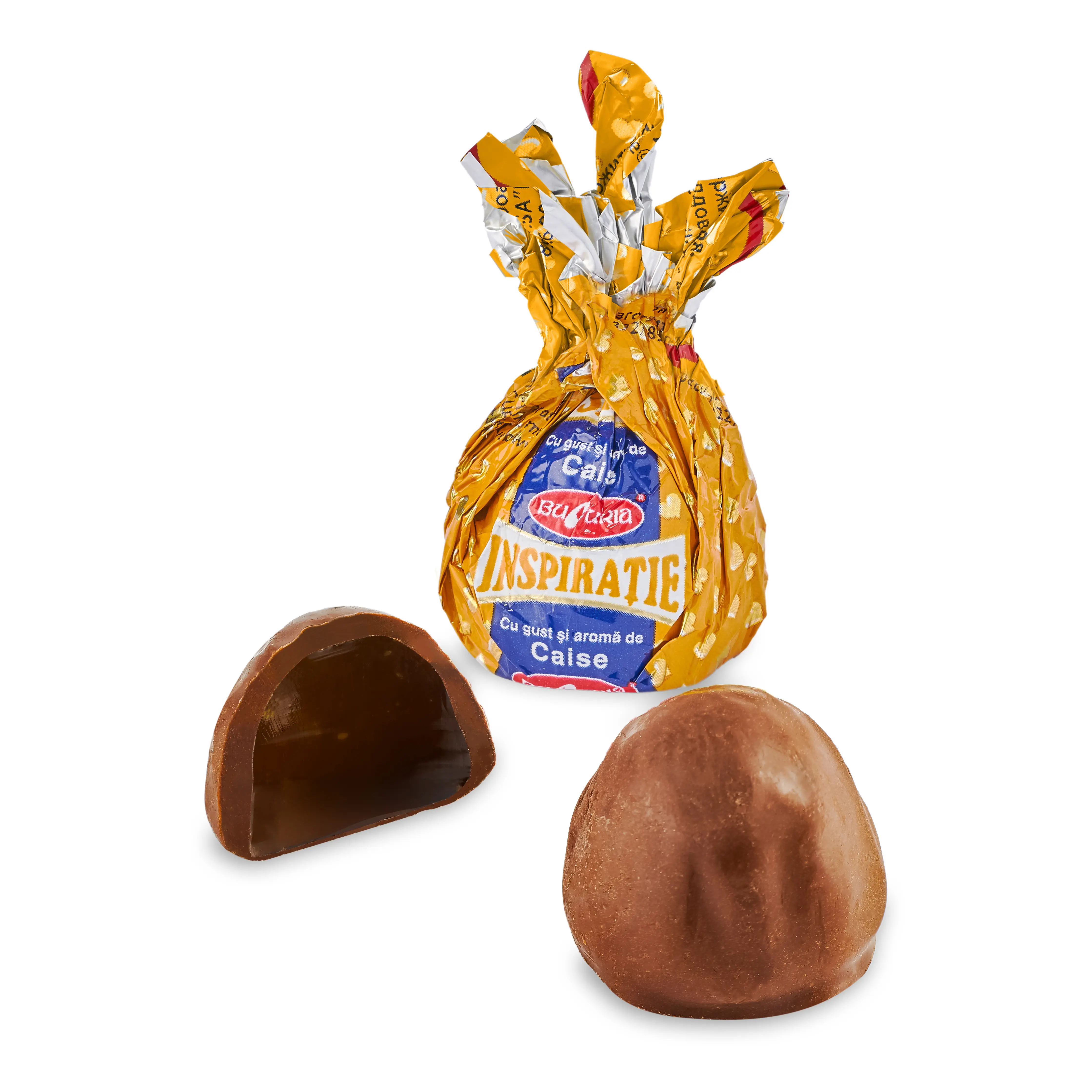 Bomboane din masă de jeleu cu gust și aromă de caise în formă de cupolă glasate cu glazură de ciocolată.