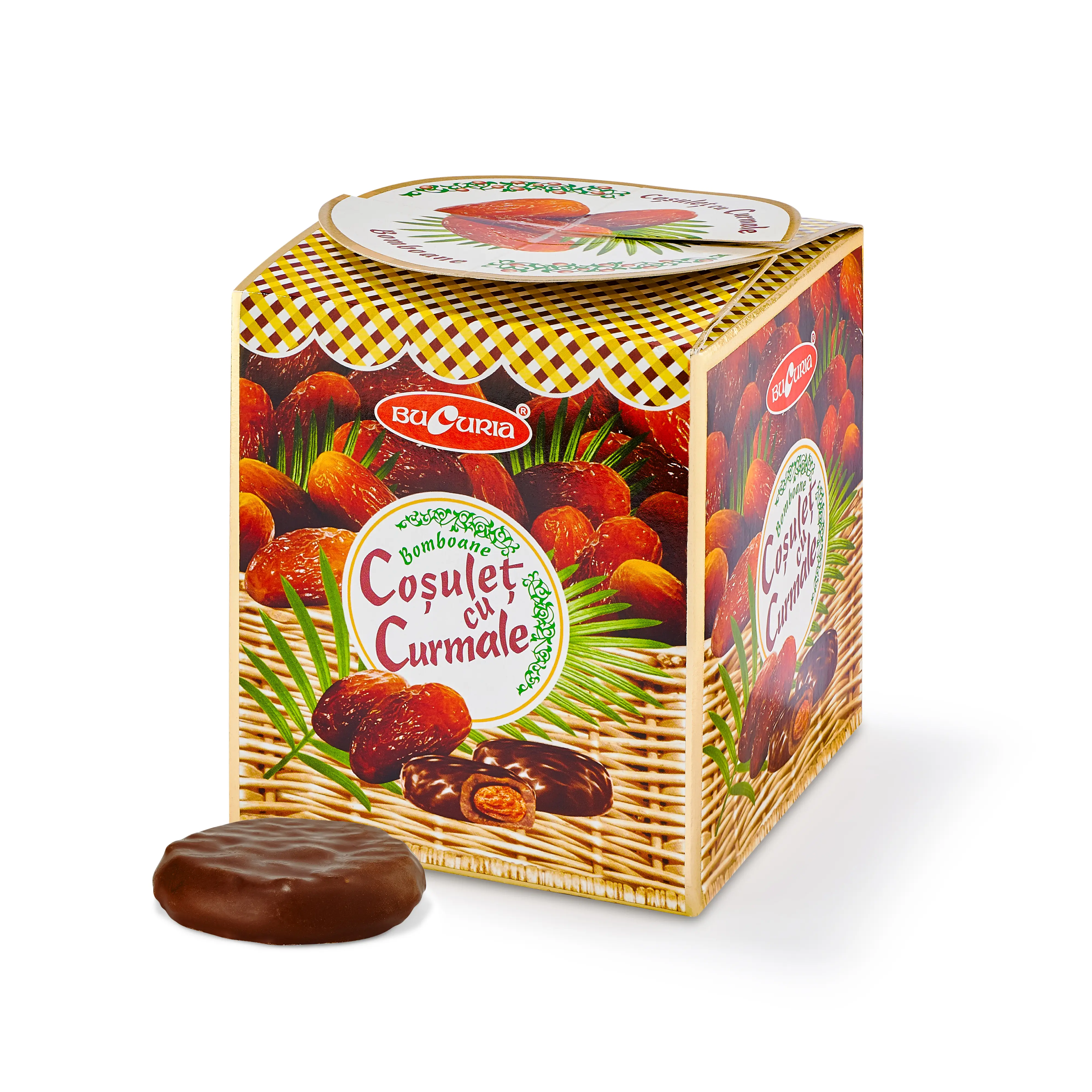 Cutie frumoasă şi originală în care veţi găsi dulce curmale, glasate cu glazură de ciocolată. Gustos, natural şi plăcut! Lăsaţi-vă copleşit de gustul dulce al vieţii.
