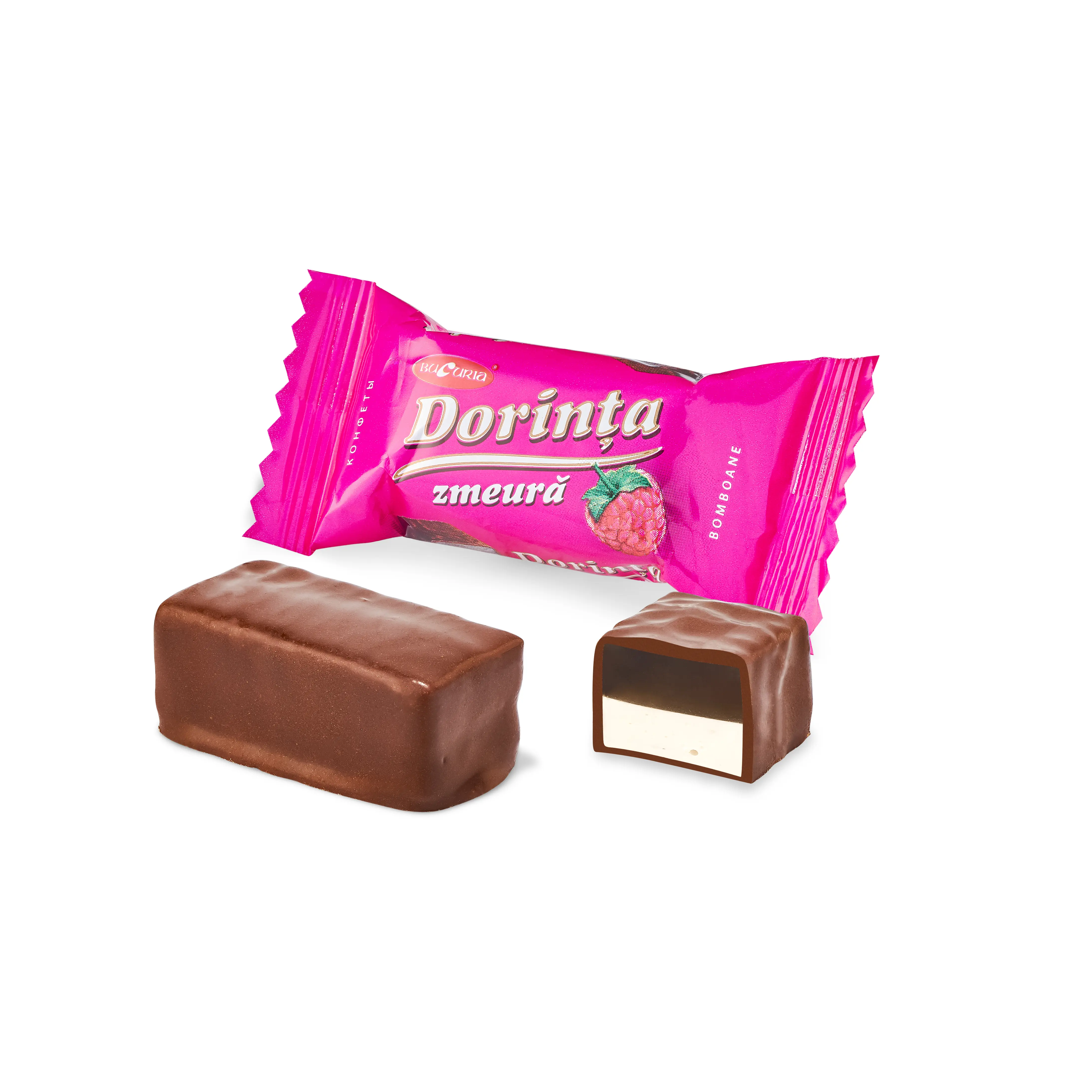 Bomboane fine din două straturi - un strat spumos şi unul din jeleu cu adaos de gem din zmeură, glasate cu glazură de ciocolată.