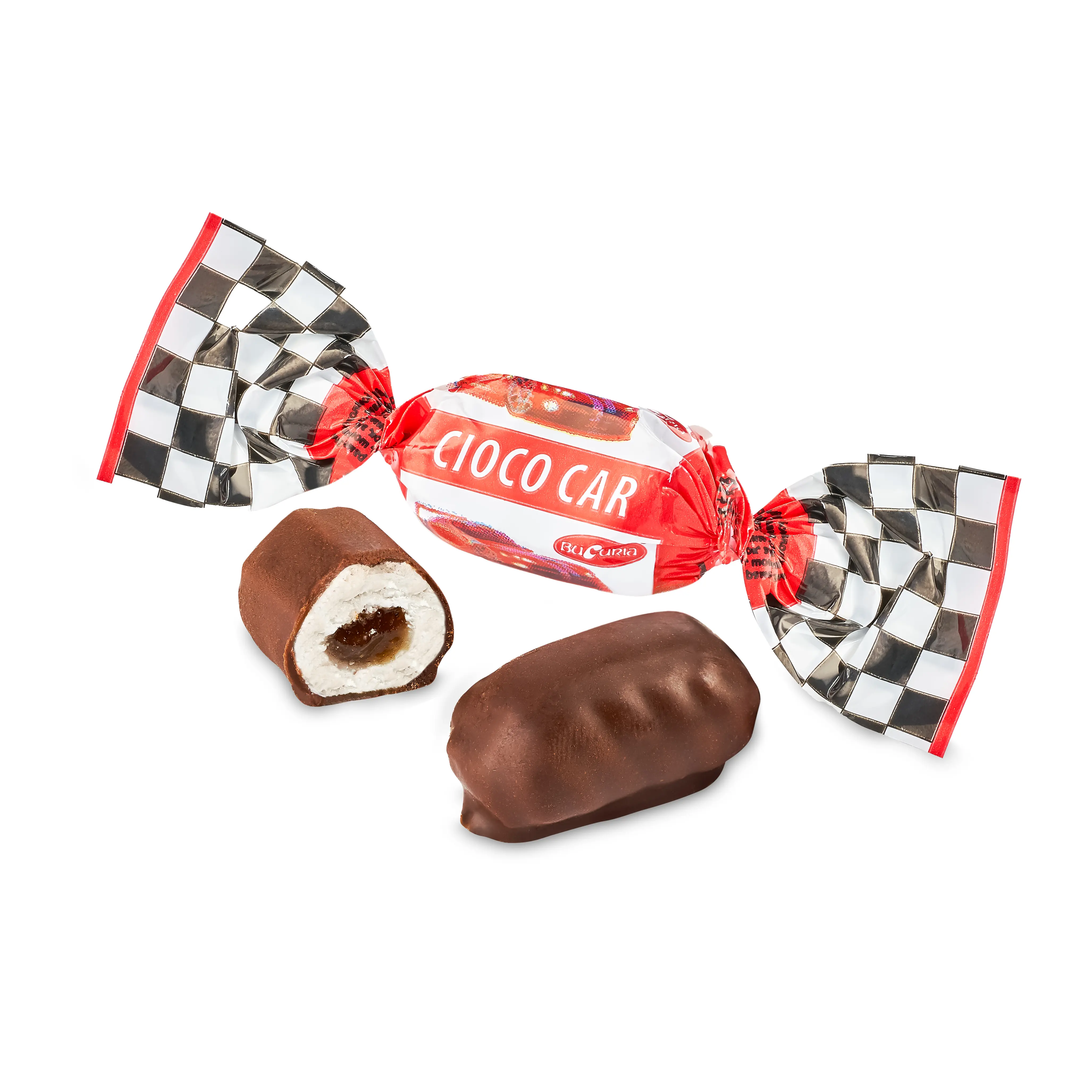 Карамель с фруктовой начинкой, глазированная классической шоколадной глазурью.