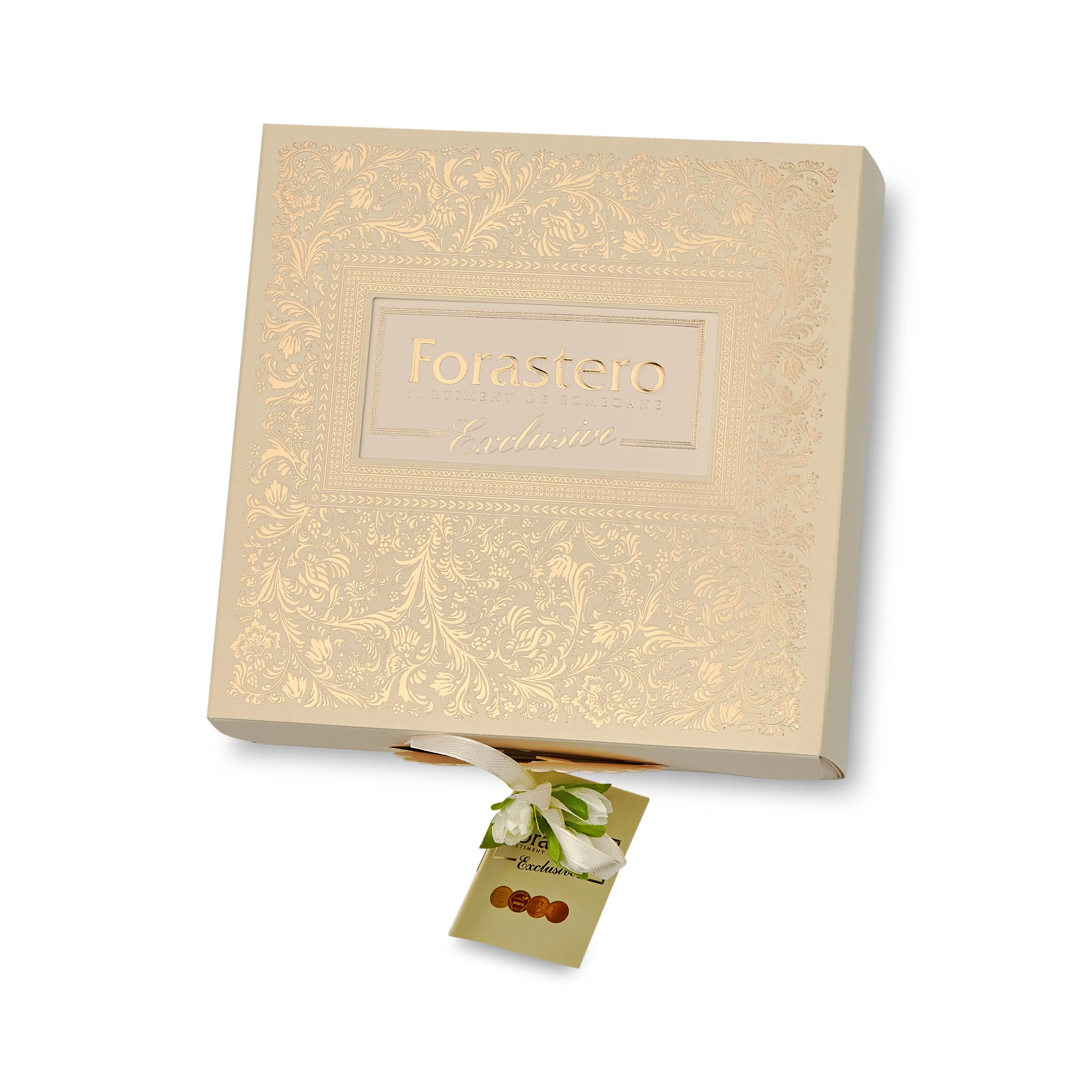 Коллекция конфет различных форм с отличными вкусовыми качествами ручной работы из белого, молочного и чёрного шоколада, с вкусной начинкой из варенья зеленых орехов, сублимированной черники, лесных орехов, чернослива и лепестков роз, с нежным кремом из молока и ванилина.Почувствуйте неповторимый вкус и аромат каждой конфеты из ассортимента Forastero «Exclusiv»!
