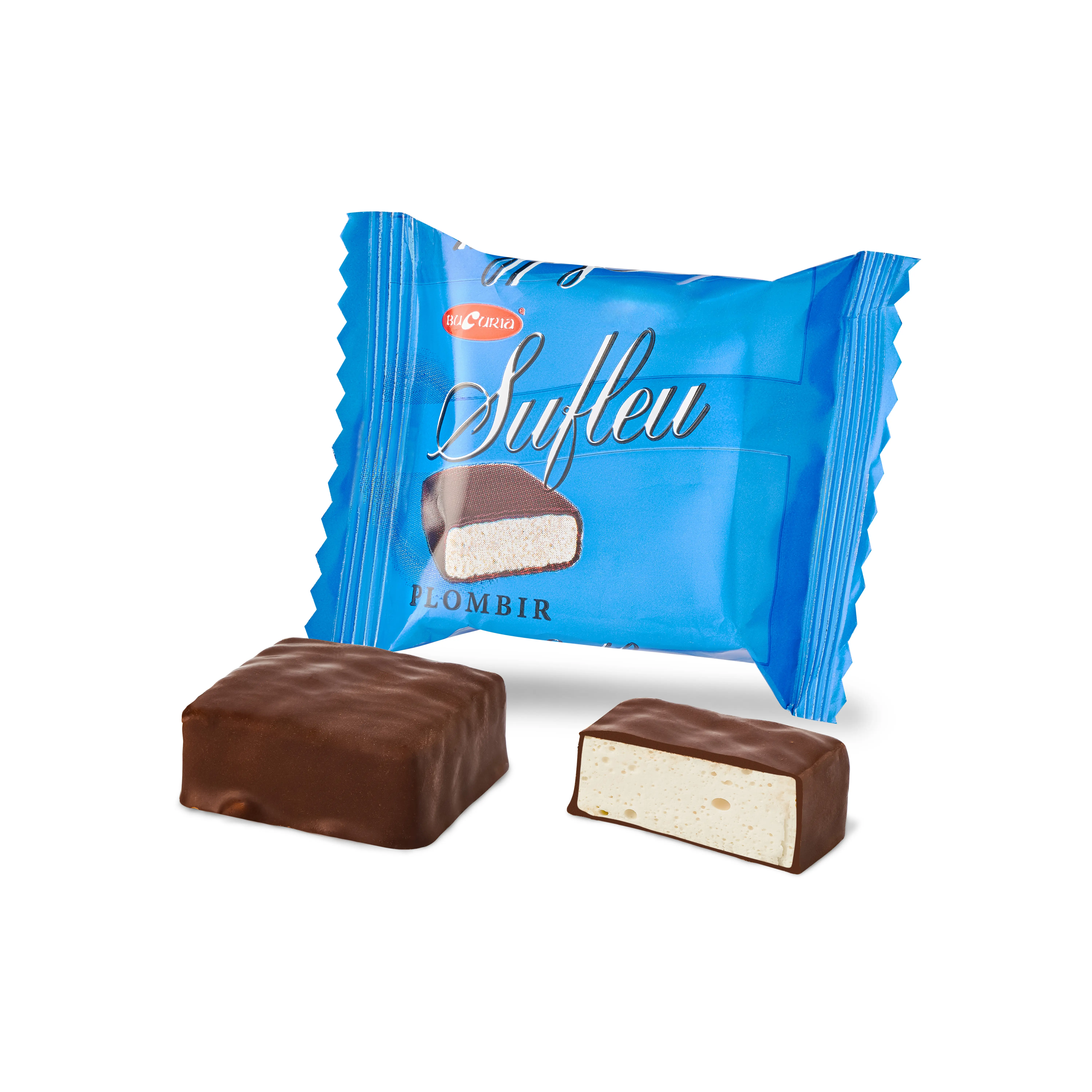 Сахар,шоколадная глазурь 30% (сахар, какао тертое, эквивалент какао масла (пальмовый, ши), какао порошок c пониженным содержанием жира, эмульгаторы: лецитин соевый, E476; ароматизатор „ванилин”), патока, молоко сухое обезжиренное 3,0%, желеобразователь агар, сухой яичный белок,консервант сорбат калия, стабилизатор инвертаза, спирт этиловый ректификованный из пищевого сырья 0,1%, ароматизаторы: "пломбир", "ваниль сливки".